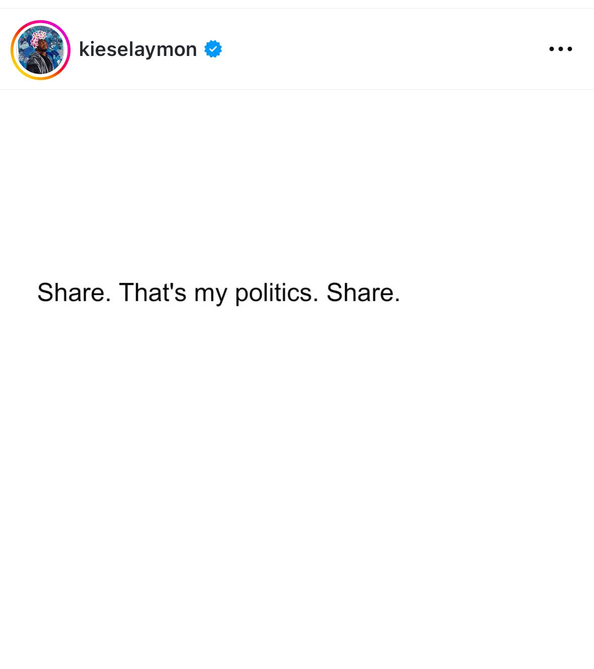 Screenshot of author Kiese Laymon's IG post reads, "Share. That's my politics. Share."